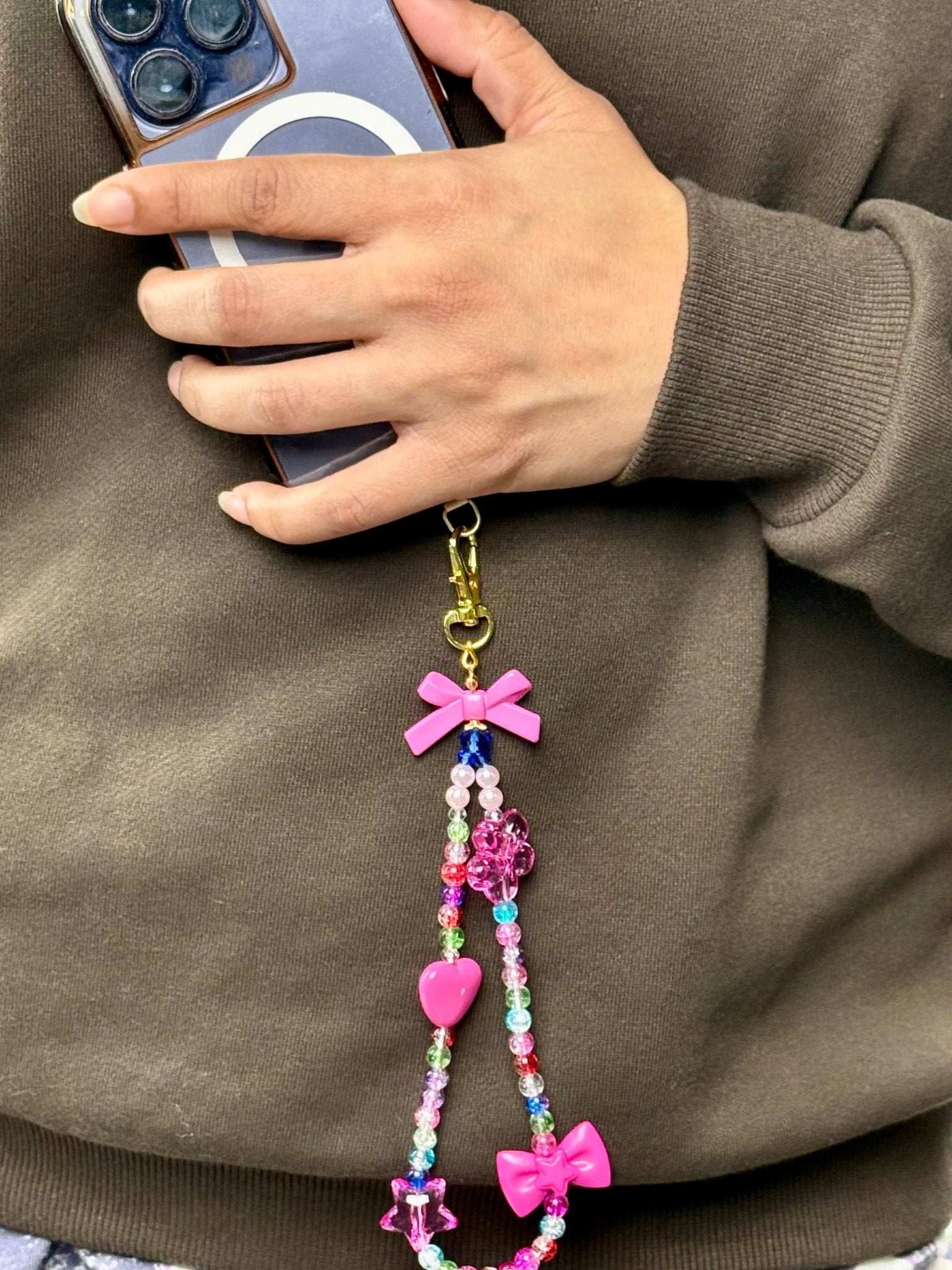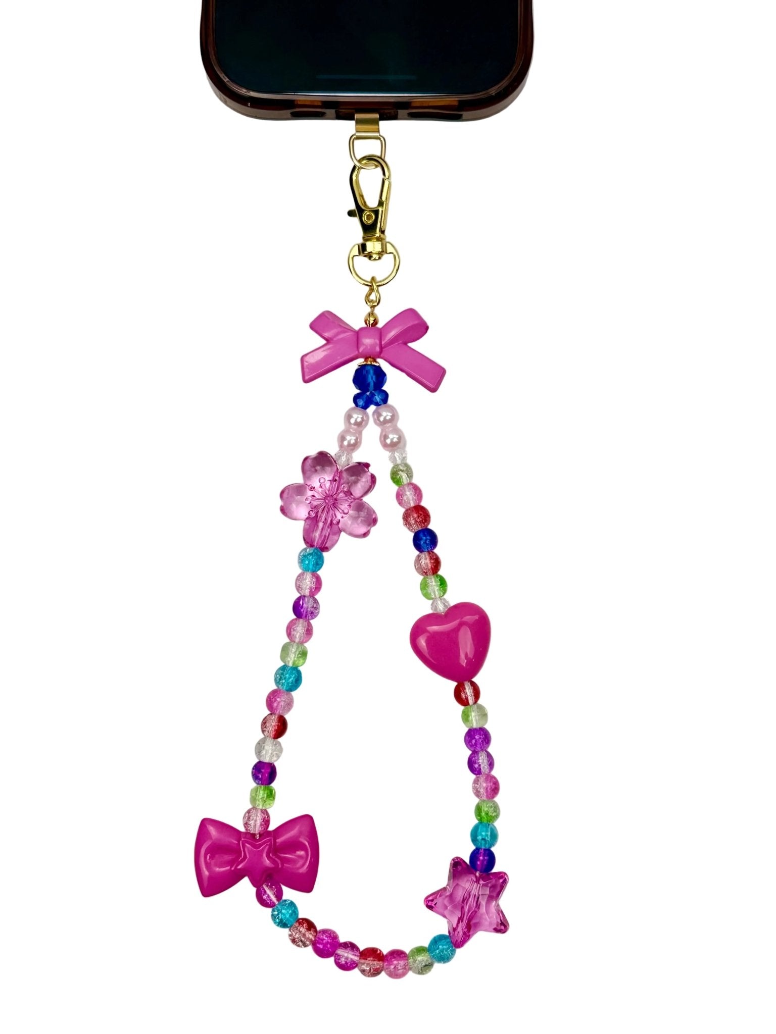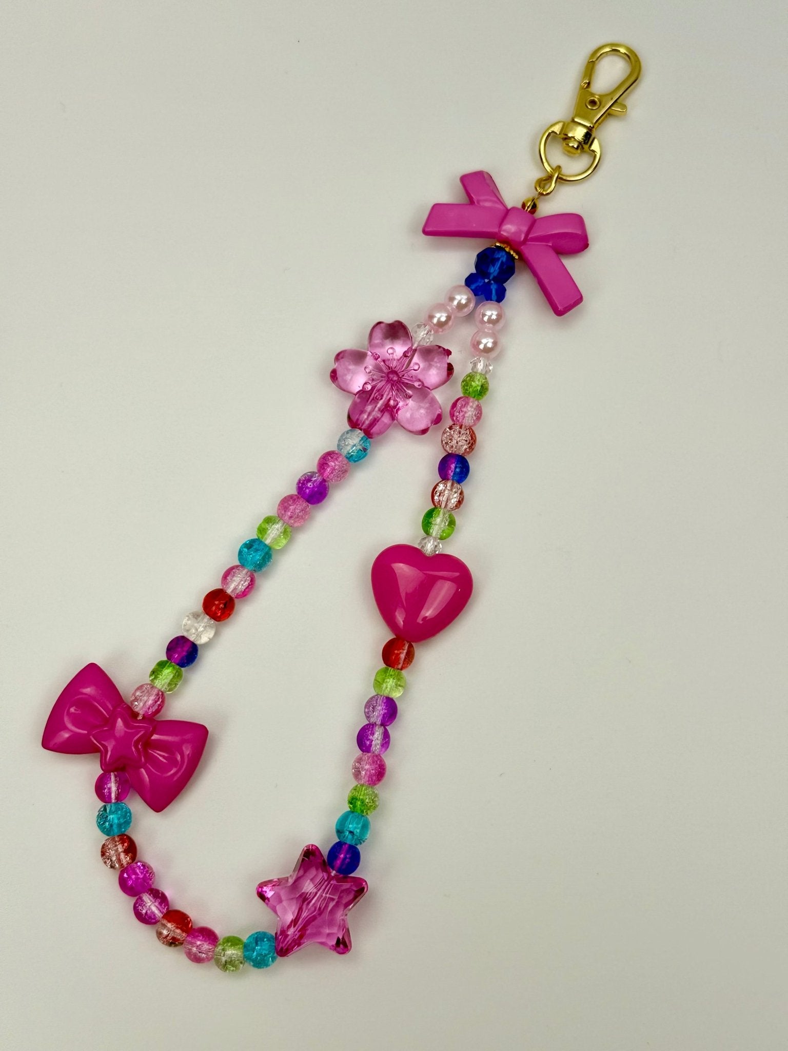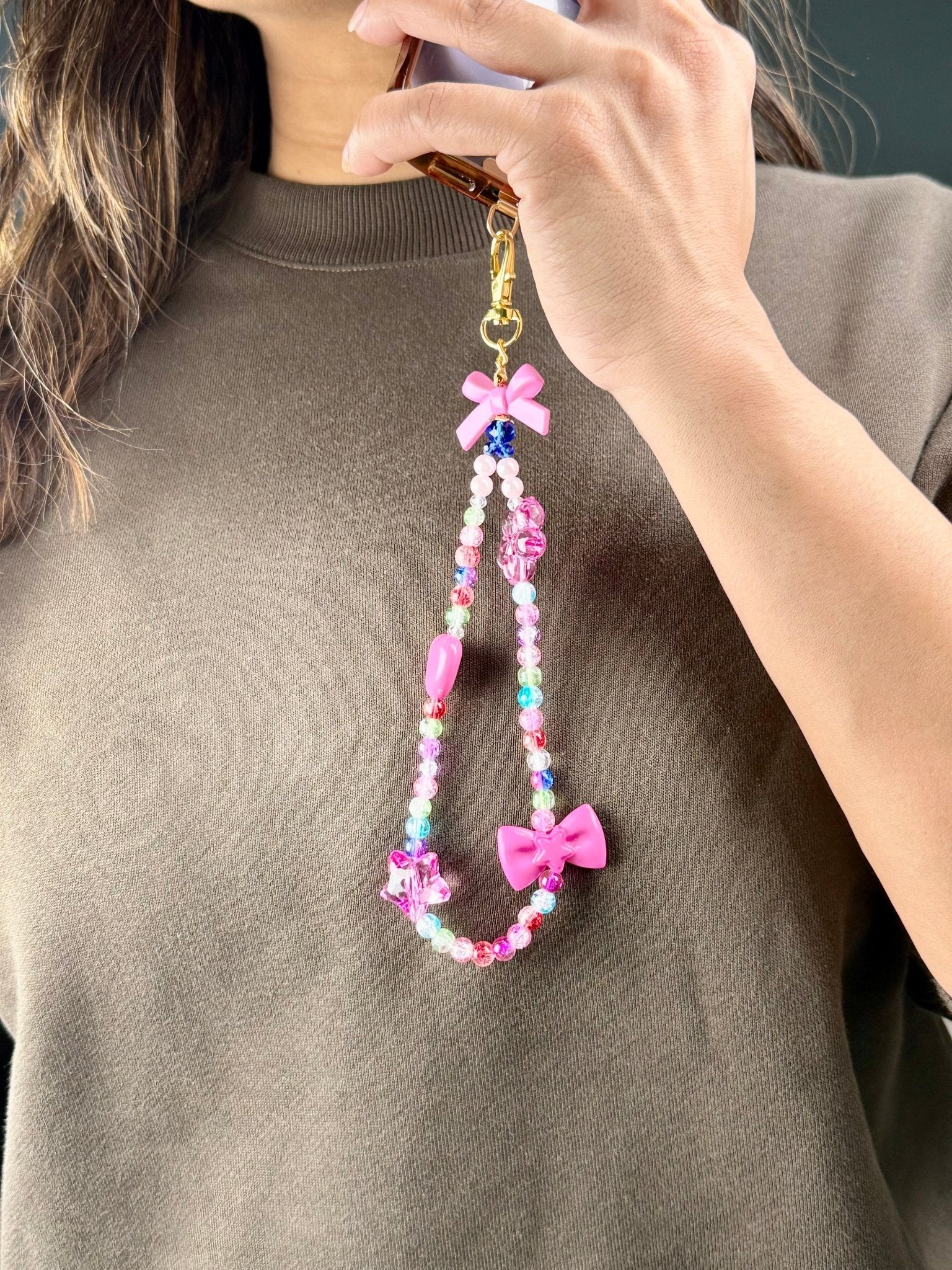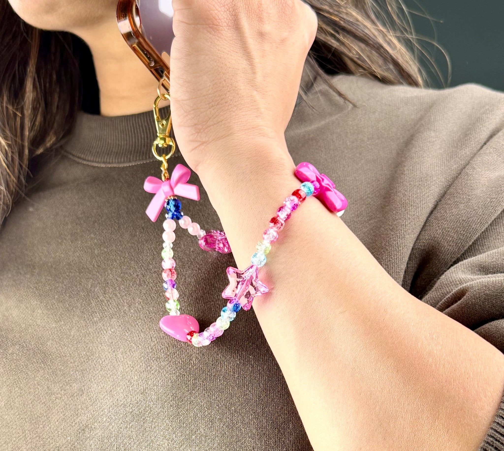 Pink Bow Rainbow Phone Charm – Beaded Wristlet Strap for Phone Case