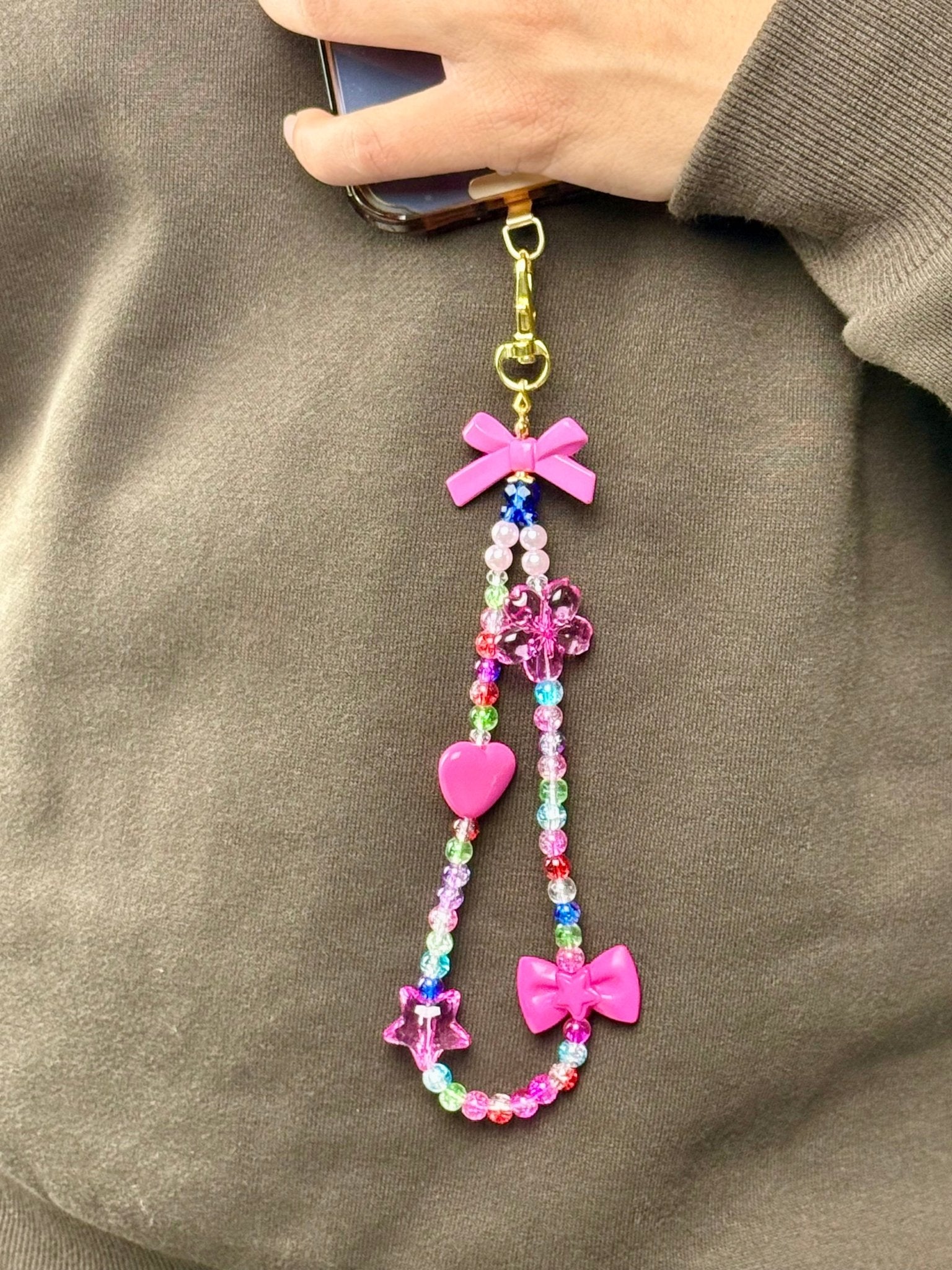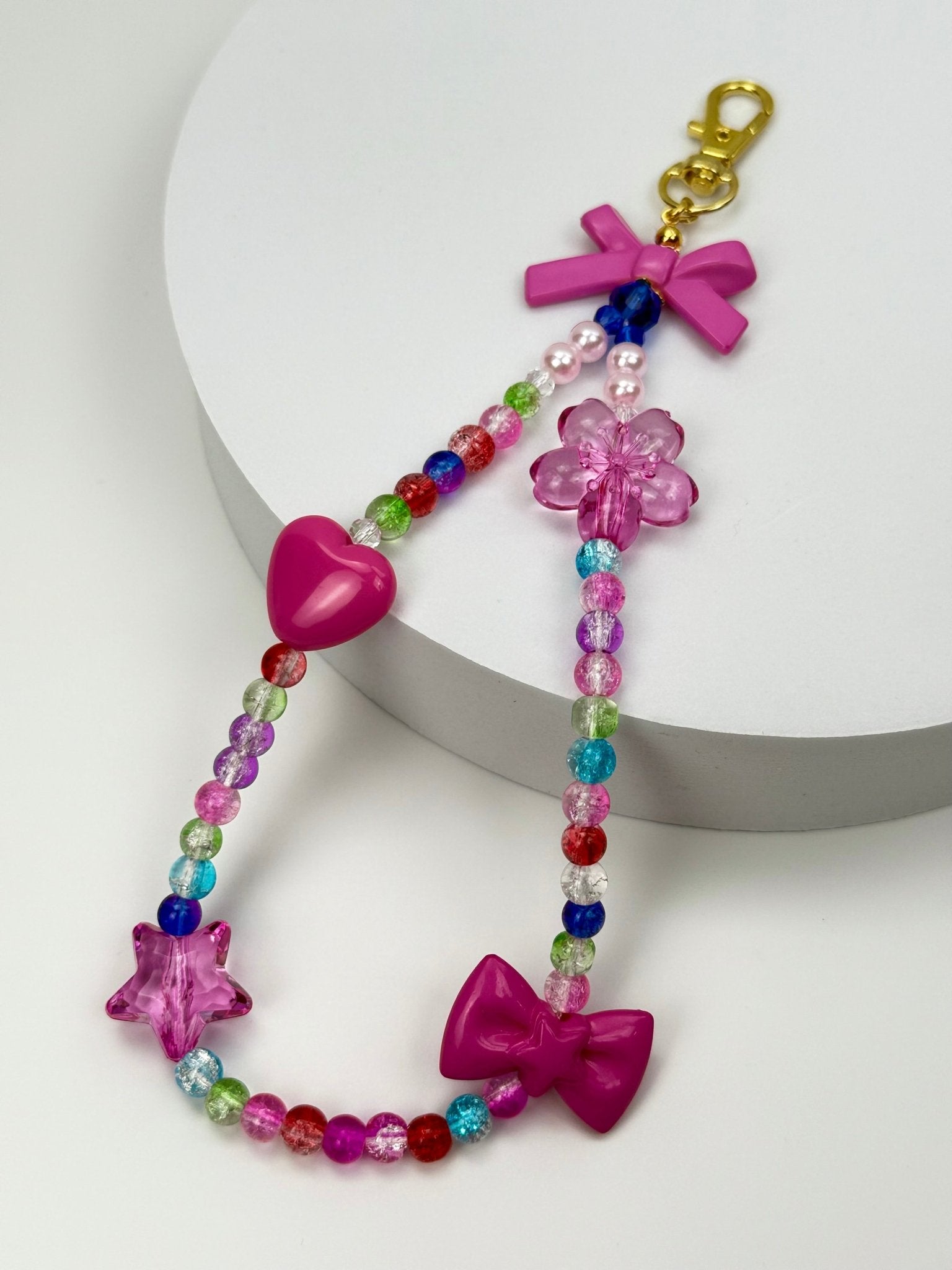 Introducing the Pink Bow Rainbow Phone Charm, a dreamy, kawaii-inspired phone wristlet designed for anyone who loves cute, colorful accessories. This handcrafted piece features a mix of rainbow crystal beads, pink heart charms, flower accents, star beads, and adorable pink bow details for the ultimate girly aesthetic.
