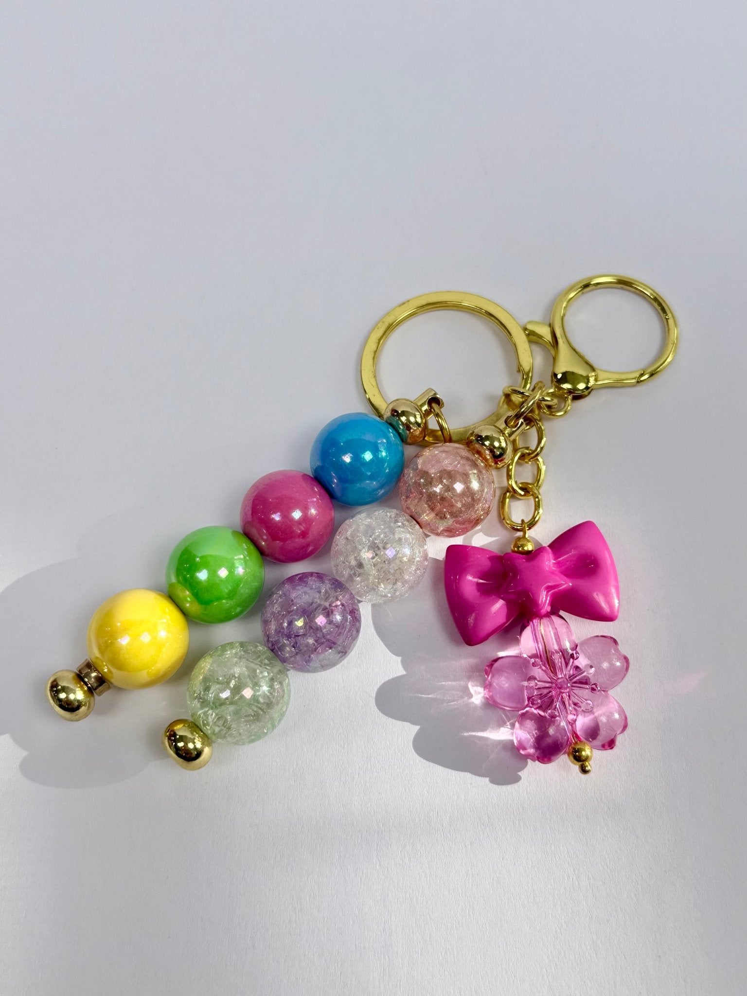 • Handmade keychain with rainbow beads, bow, and flower charm